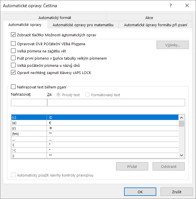 Menu Soubor ->Moznosti -> Kontrola pravopisu a mluvnice ->Moznosti automatickych oprav