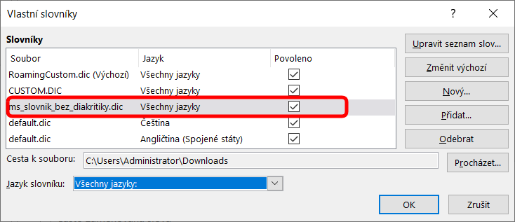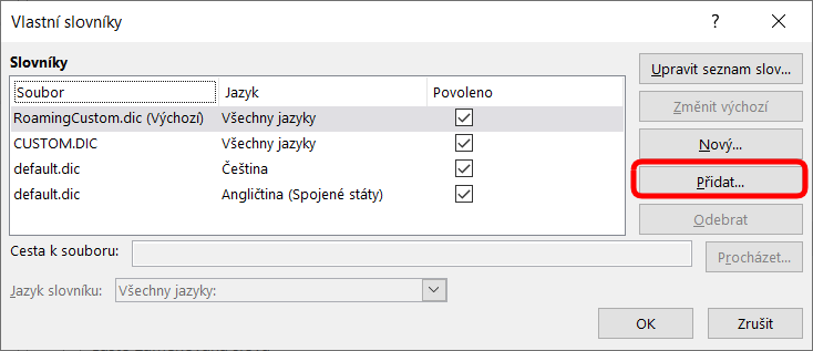 Menu Soubor ->Moznosti -> Kontrola pravopisu a mluvnice-> Vlastni slovniky